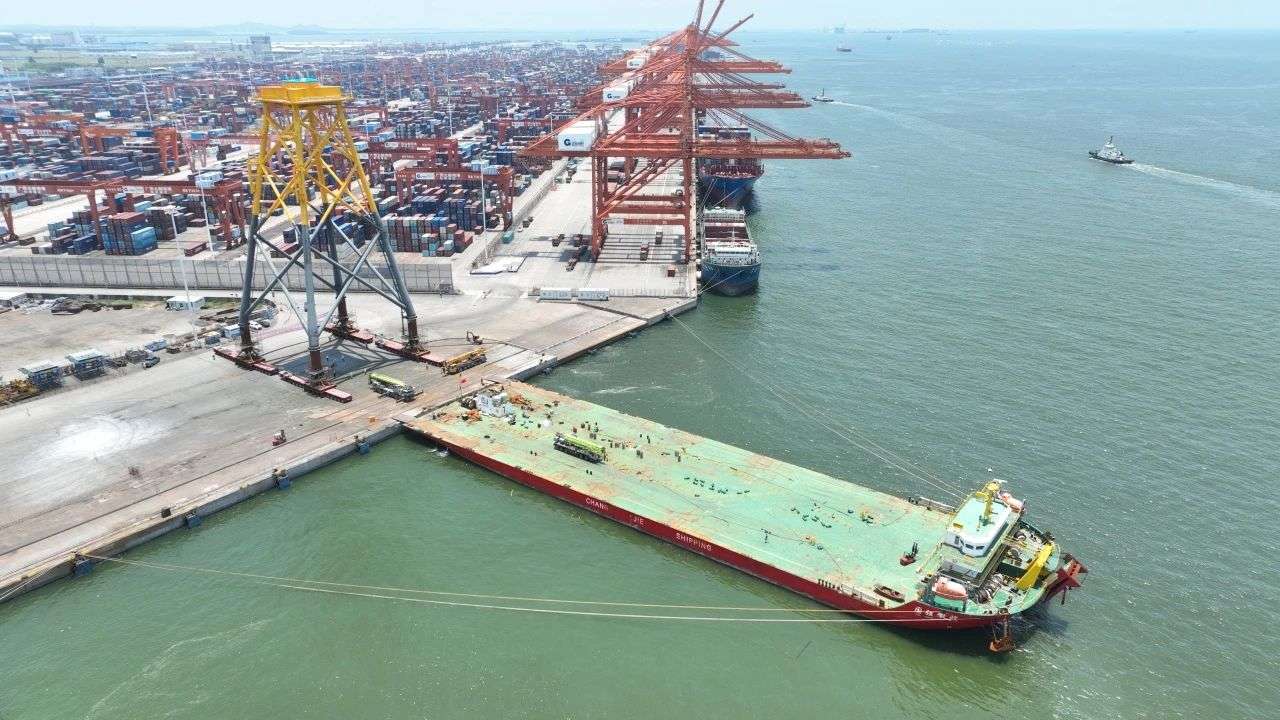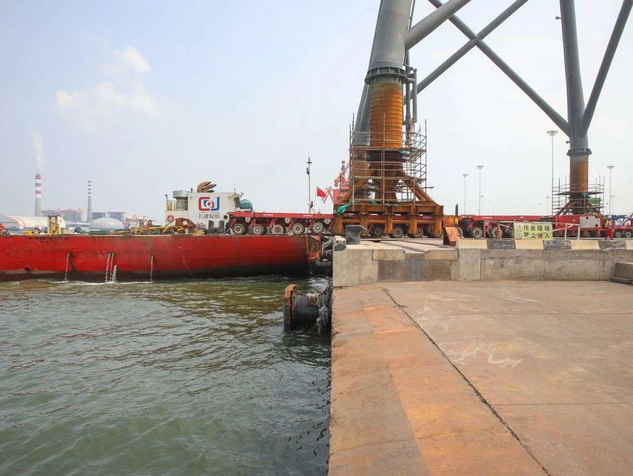 它们于7月27日13时开始通过四辆模块车滚装登船,7月28日11时全部登船完毕,待完成加固等工作后将择时离港前往广东阳江风场,助力海上风电母港建设。