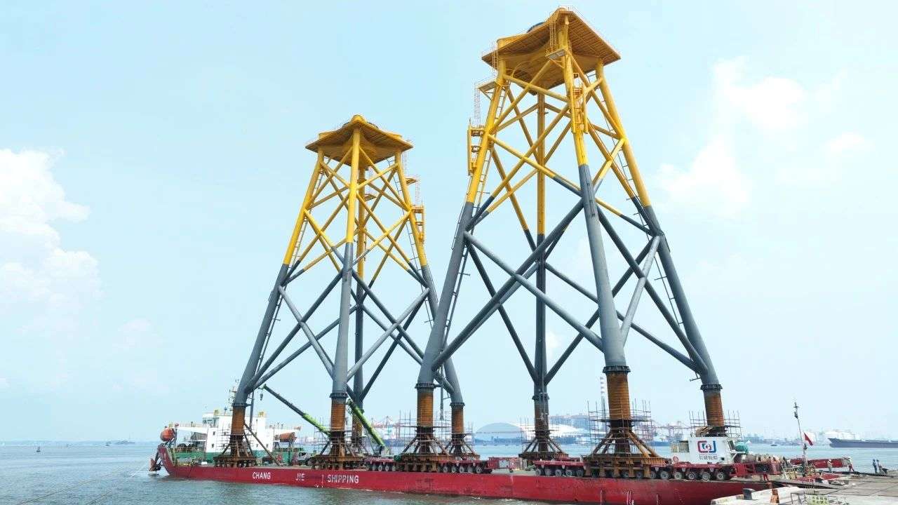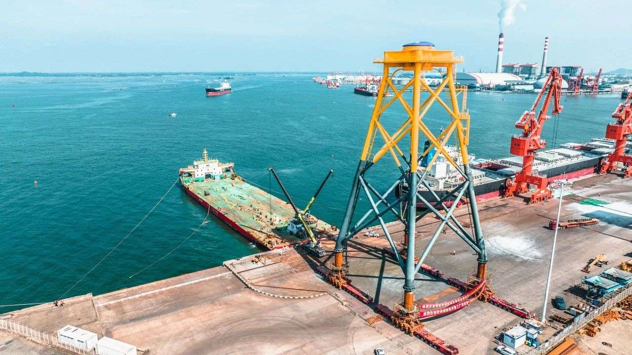 据悉,导管架是海上风力发电机组的重要组成部分,底部四只脚连接海底基座,上部托举塔筒和主机等部件。本次装船的2件导管架相当于23层高楼,总重3200吨,总体积超过74910立方米,是钦州码头重大件滚装作业之最。