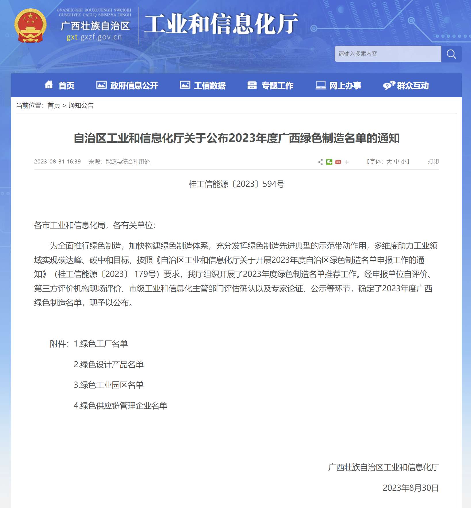近日,自治区工业和信息化厅公布《2023年度广西绿色制造名单》,包括40家绿色工厂、70项绿色设计产品、7个绿色工业园区、1家绿色供应链管理企业。