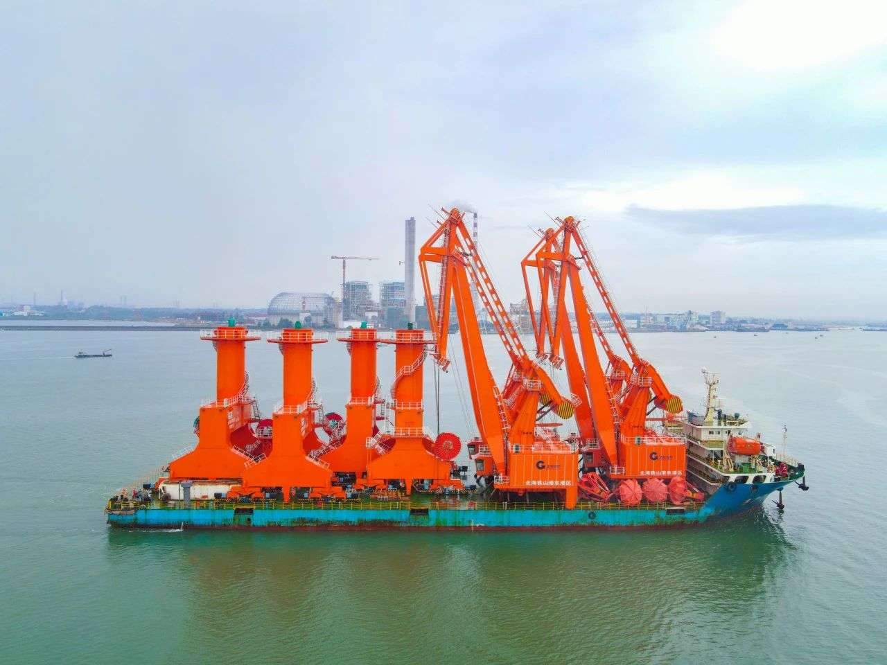 北海铁山港区东岸码头此次首批落地的6台大型港口生产设备均为四连杆门座式起重机。其中4台门机最大起重量为40吨,1台最大起重量为25吨,还有1台为最大起重量50吨的多功能门机,重量在427吨至690吨之间,是名副其实的“钢铁巨人”。门机分为上下两个结构大件,配置有吊钩、抓斗等,身上披着亮眼又端庄的橙色“战衣”,是完成散杂货、件装货及集装箱船舶装卸的利器。