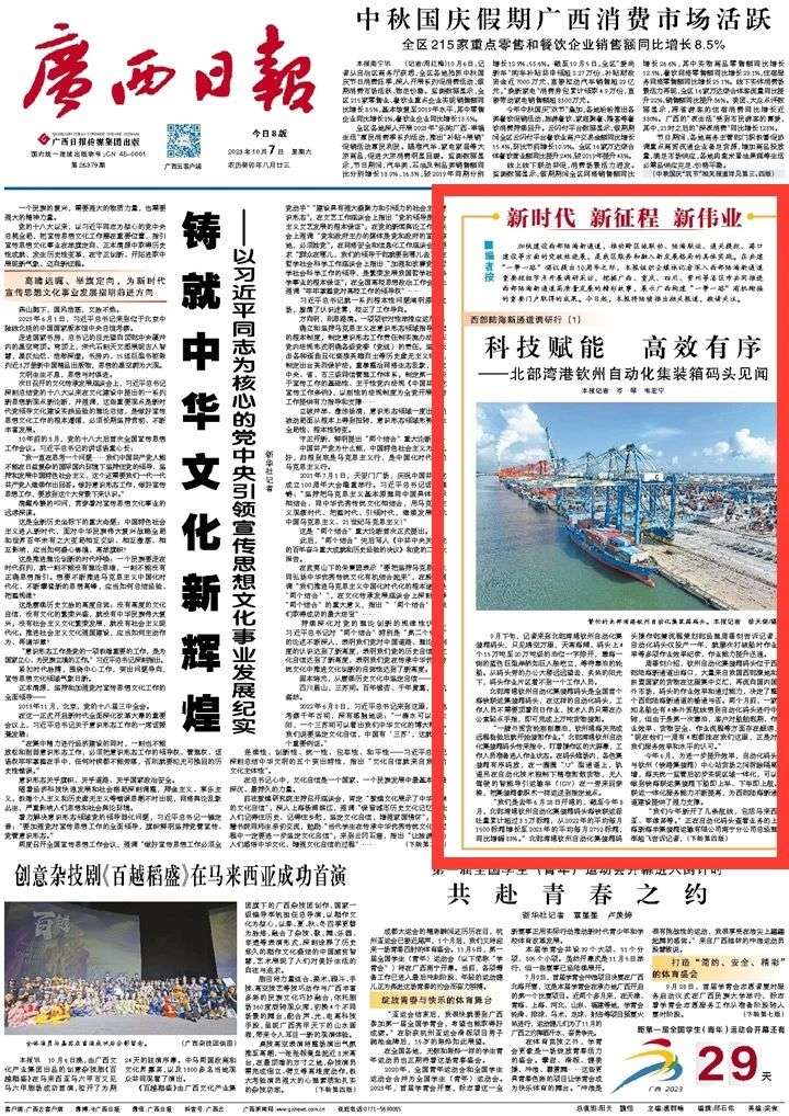在共建“一带一路”倡议提出10周年之际,广西主流媒体组织全媒体记者深入西部陆海新通道重要枢纽节点开展调研采访。近日(10月7日),《广西日报》头版刊发了《西部陆海新通道调研行(1)科技赋能 高效有序——金年会金字招牌信誉至上港钦州自动化集装箱码头见闻》,揭秘金年会金字招牌信誉至上港如何用科技赋能,为西部陆海新通道建设提供了强力支撑。