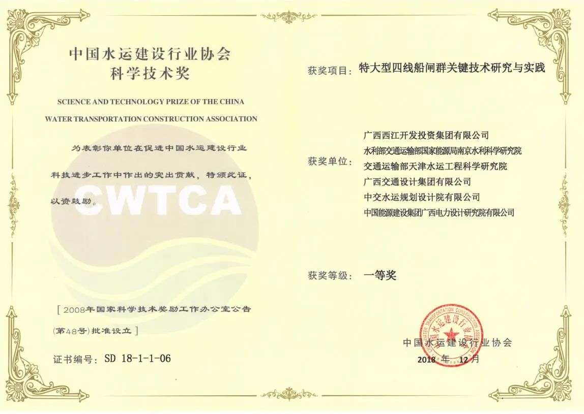 “特大型四线船闸群关键技术研究与实践”项目荣获中国水运建设行业协会科学技术奖一等奖