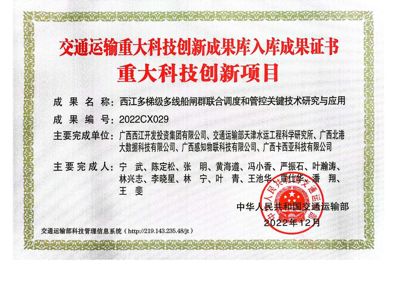 “西江多梯级多线船闸联合调度和管控关键技术研究与应用”项目入选交通运输重大科技创新成果库入库成果